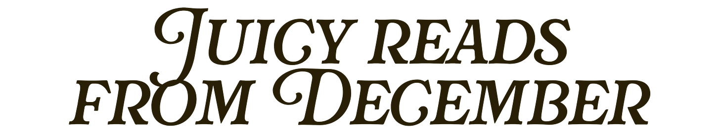 There was lots of great December (non-book!) reading, but I would be remiss not to mention Olivia Muenter’s “If the world is beautiful, then so am I.” and Tell the Bees’s “2025: The Year Everything Broke.”