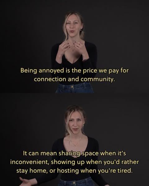 Being annoyed is the price we pay for connection and community. It can mean sharing space when it’s inconvenient, showing up when you’d rather stay home, or hosting when you’re tired.