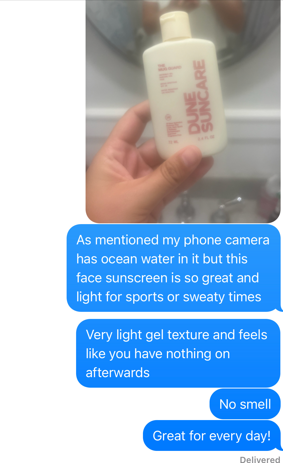 Wear a nice sunscreen, always. Do as I say, not as I do⦠we all got lobster red on Day 1. Iāve been really liking this one for face, from Dune! Itās very on sale right now. If you donāt believe me, see what I texted my mom about it.