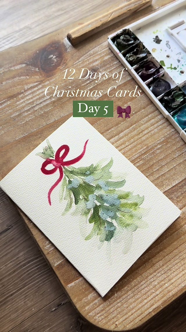 @jennabstudio🎀Love is in the air for Day 5 in our watercolor Christmas card series. To paint healthy, natural shaped mistletoe you will want to focus on brush strokes. With vibrant green paint already on your brush - apply gentle pressure to your brush, drag for a single second, then LIFT to the tip of your brush to give a seamless edge to your leaves. 🙋♀️Adjust the water:paint ratio you use for each leaf to create different values of green and more visual interest within the bunch #christmascardmaking #holidaycheer #crafting #mistletoe #12daysofchristmascardsTiktok failed to load.