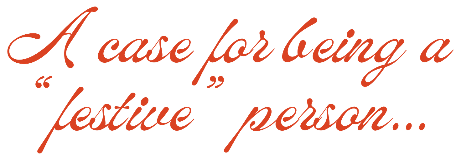 Last year I wrote about my approach to living longer— no, not exercise and salad, though those help— being festive as fuck, excuse my French. People who delight in stupid made-up holidays, late-stage capitalism driven or not, are set up for longer, happier lives. I don’t make the rules, but I’m pretty sure there’s something scientifically real to be said for finding and creating joy and community at every opportunity. If you’re lost, craving connection, seasonally depressed, or just feel like the holidays are more a chore than a FUN few months, I’m inviting you to shift your perspective.